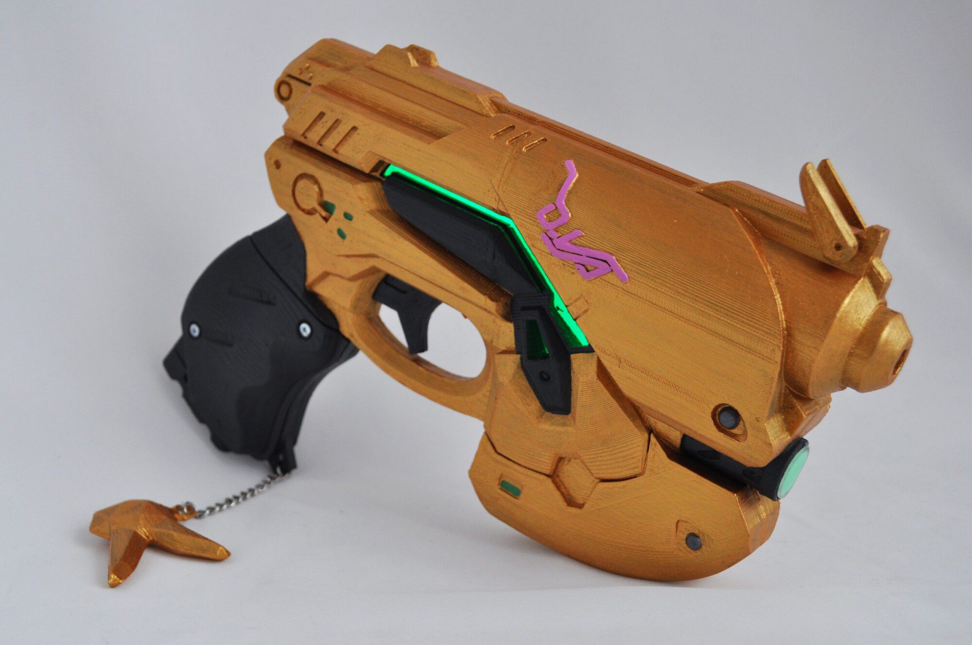 This is D.Va light gun prop in a Golden skin from Overwatch. D.va uses this blaster while her MEKA is unavailable.