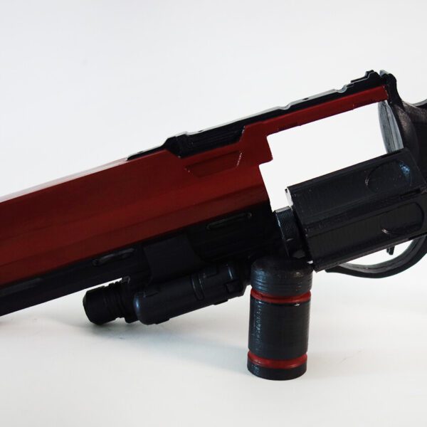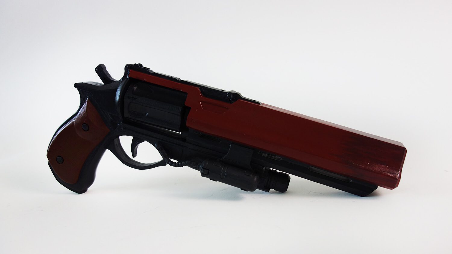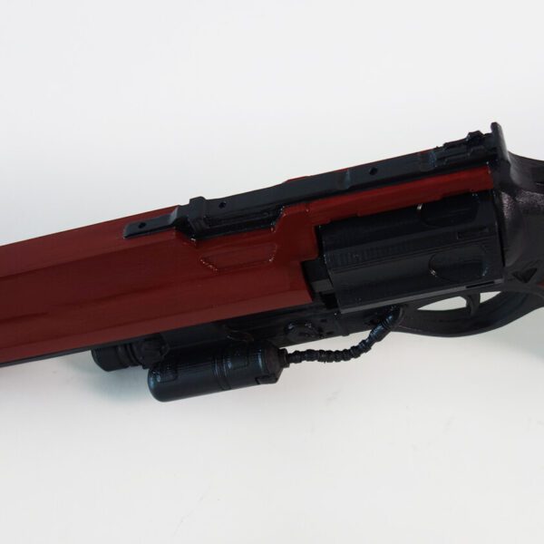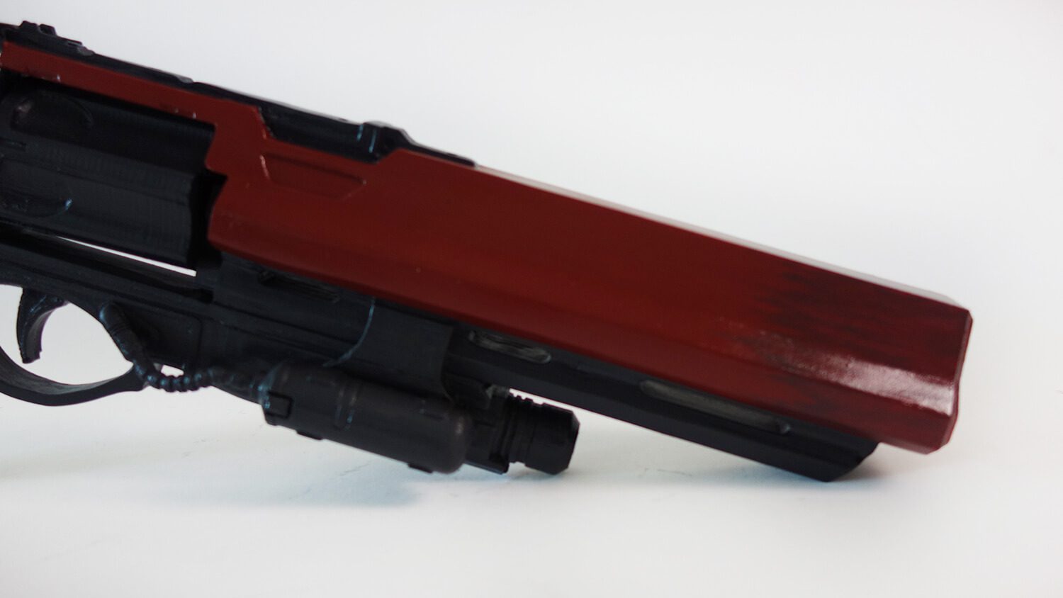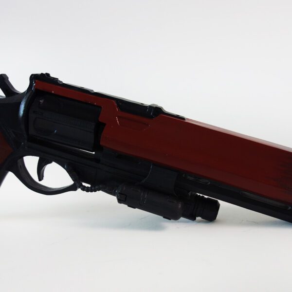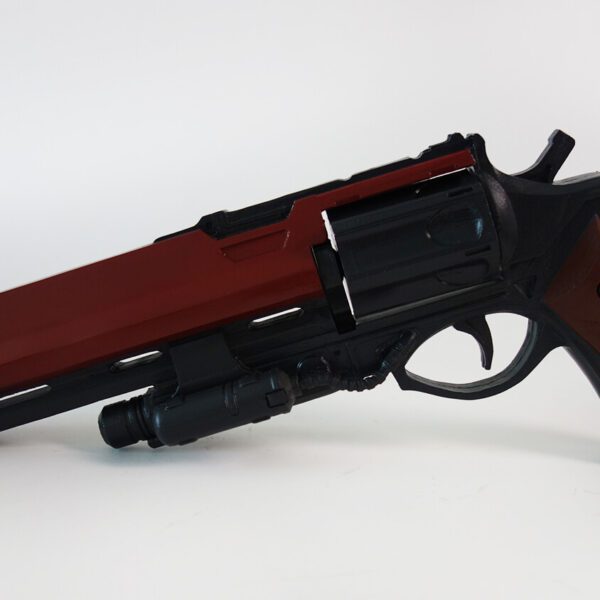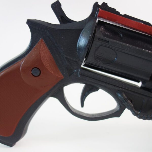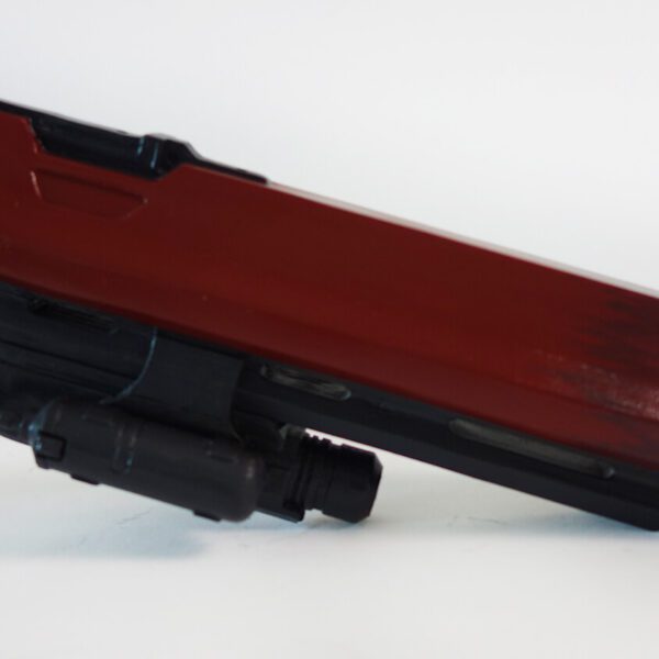 This gun is made of plastic, assembled and sanded, hand painted with acrylic paint and varnished with a satin/glossy finish, so the paint could remain as long as possible. If you want to change color – no problem. Just let us know.