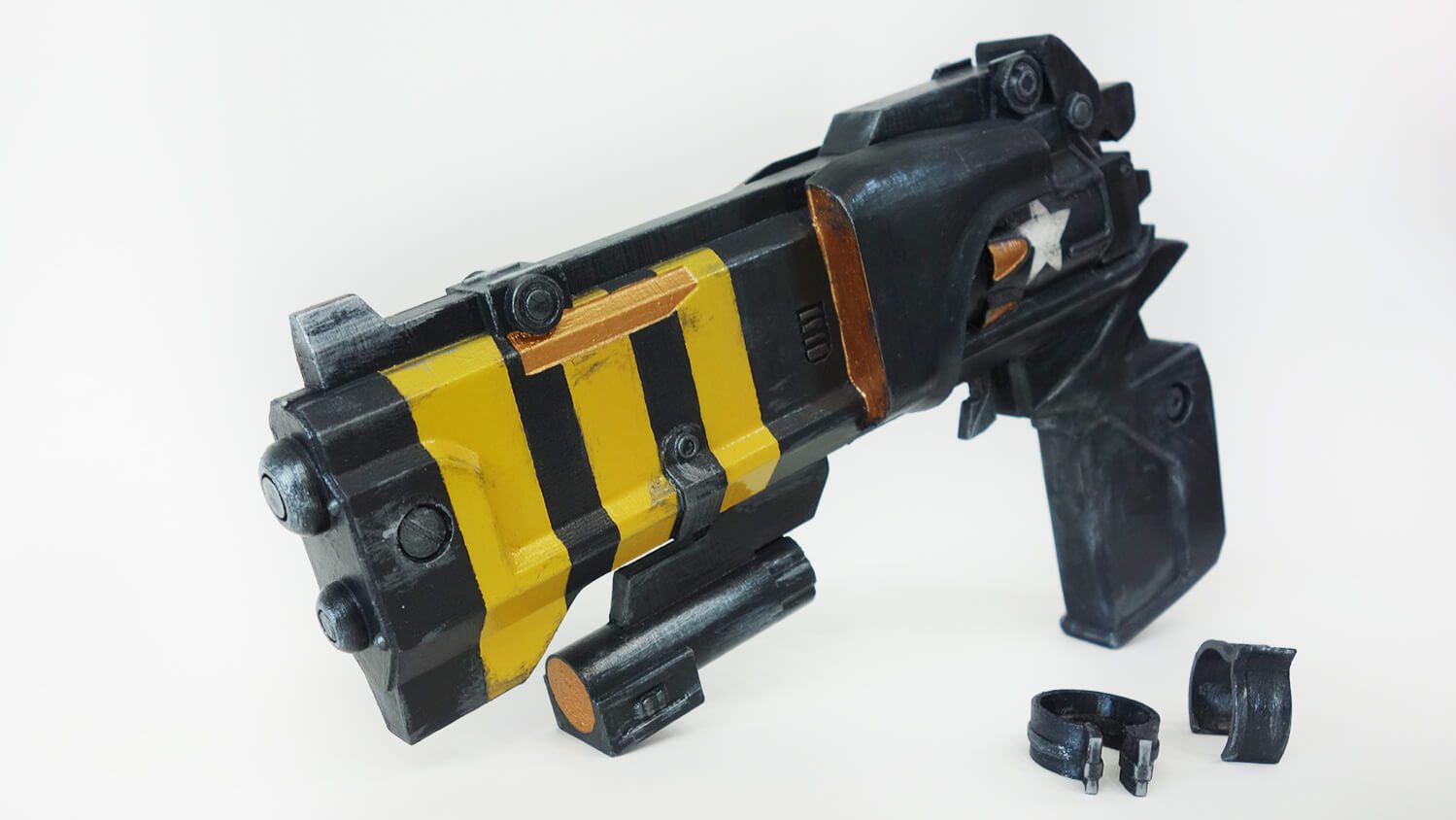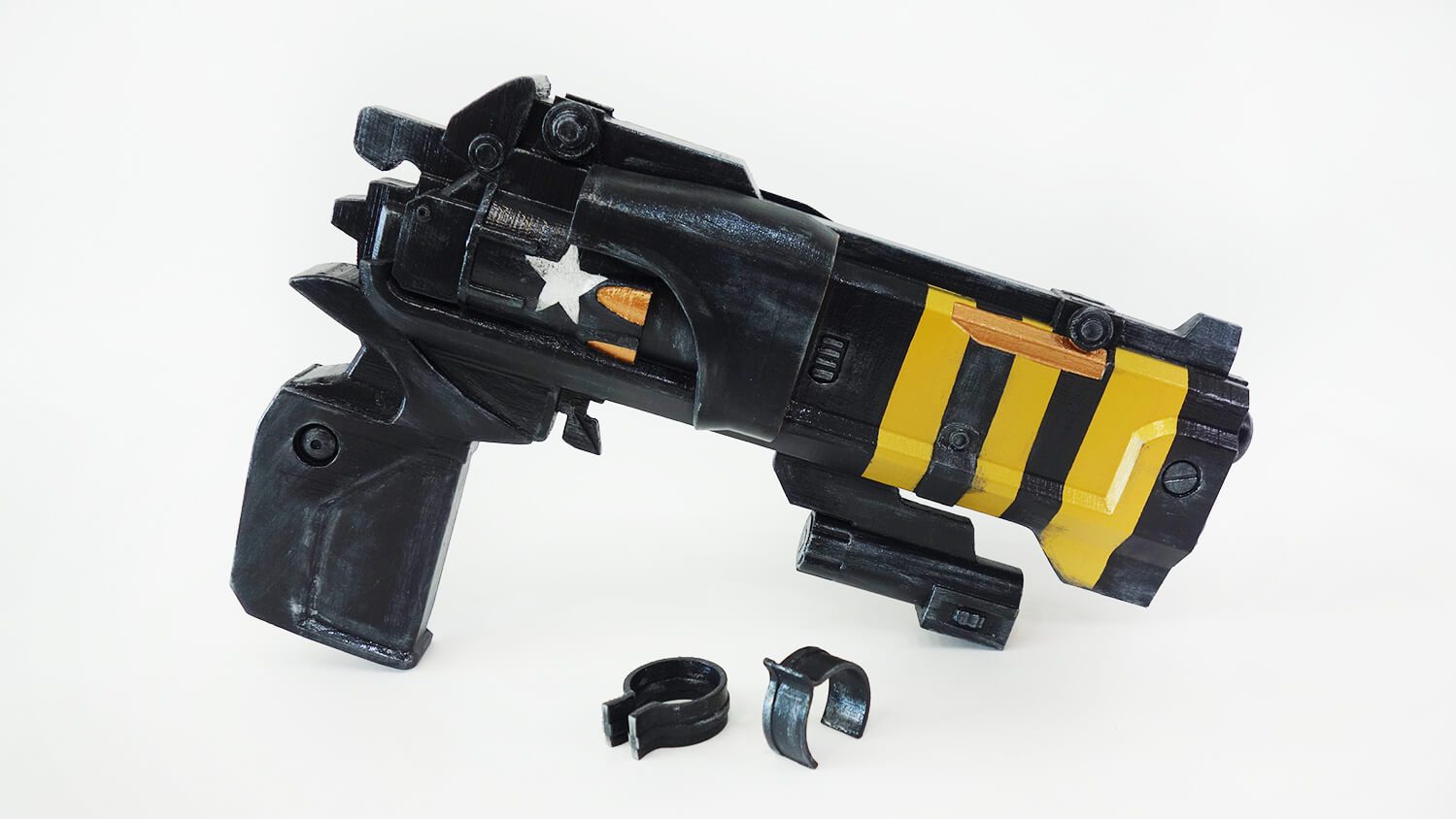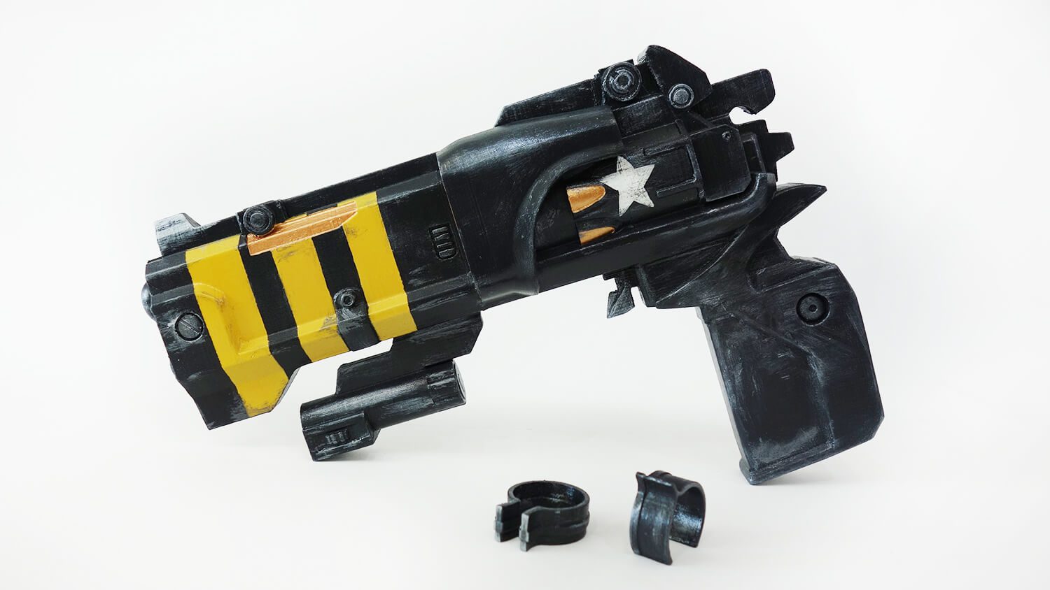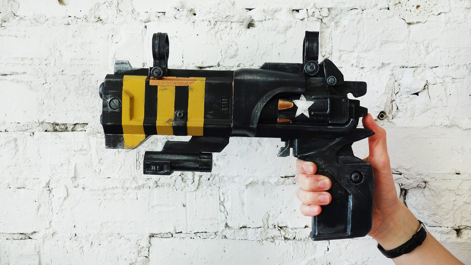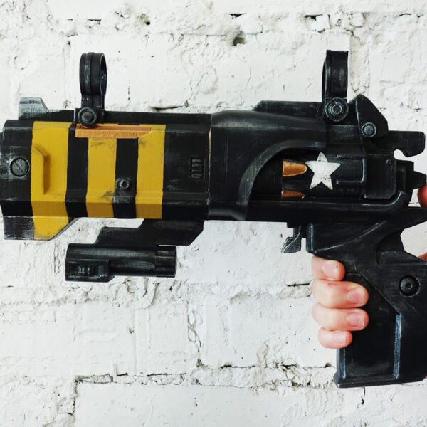 This hand cannon is made of plastic, hand-painted with acrylic, and varnished.